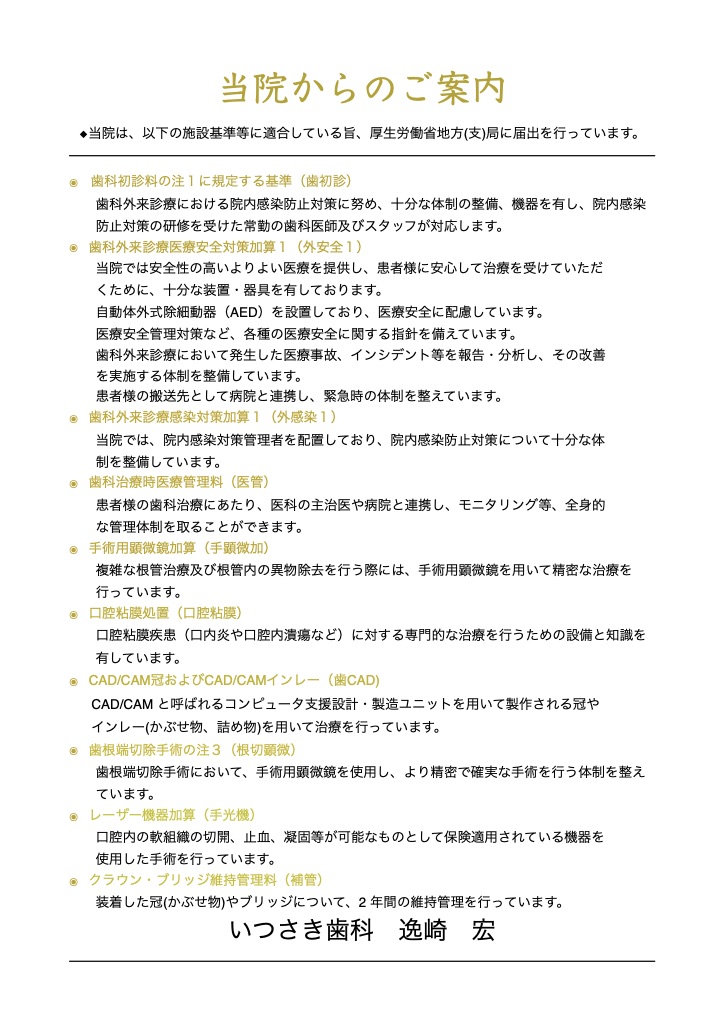 また、治療を始める前には、現在のお口の状態や治療計画について、難しい言葉は使わず、丁寧にわかりやすくご説明します。ご不明な点やご希望がありましたらお気軽にお声がけください。